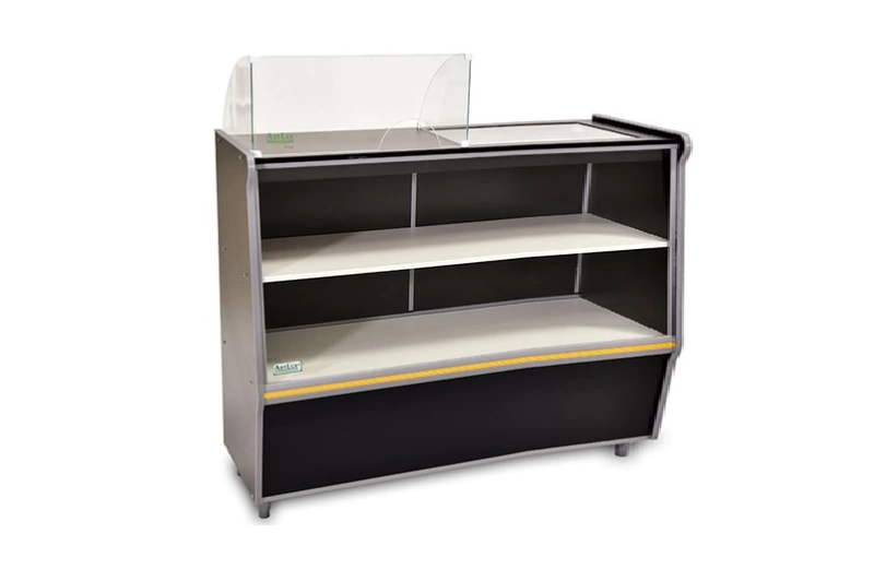 Balcão tipo vitrine seca, ideal para exposição de produtos que não necessitam de refrigeração. Combina praticidade, design moderno e ótima visibilidade.