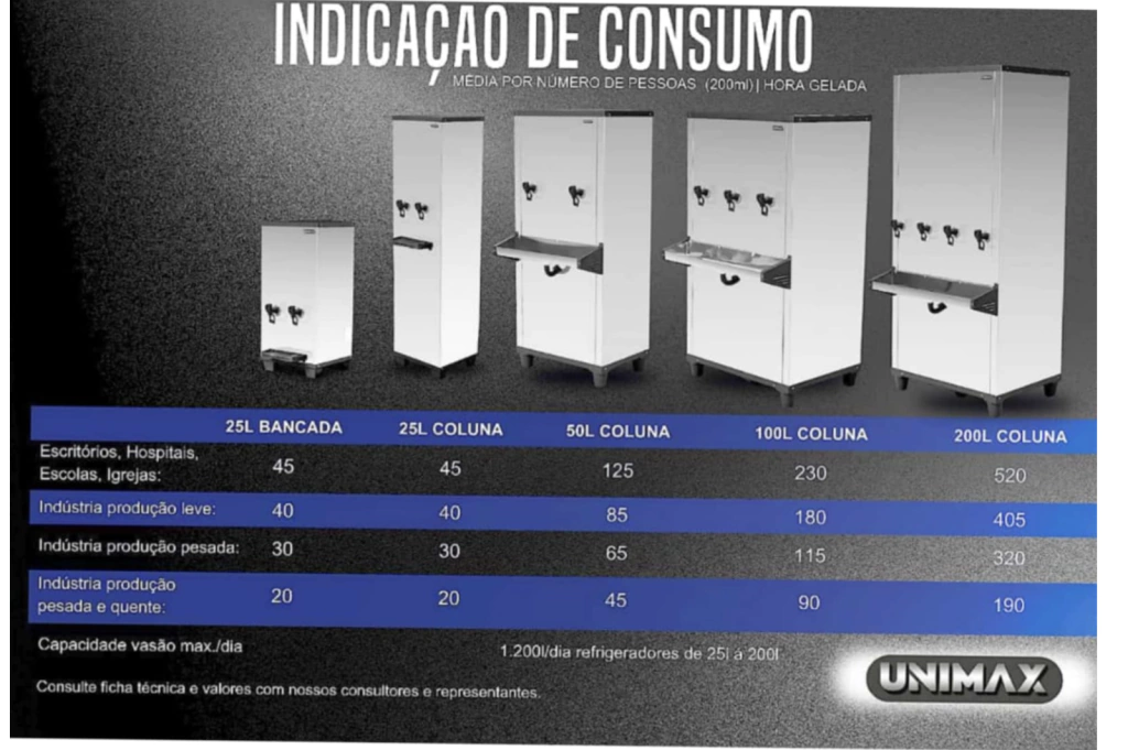 Capacidade de Atendimento: - Igrejas, Escritórios, Hospitais e Escolas: Até 230 copos (200ml) por hora. - Indústrias: Capacidade varia de 90 a 180 copos, dependendo da produção.