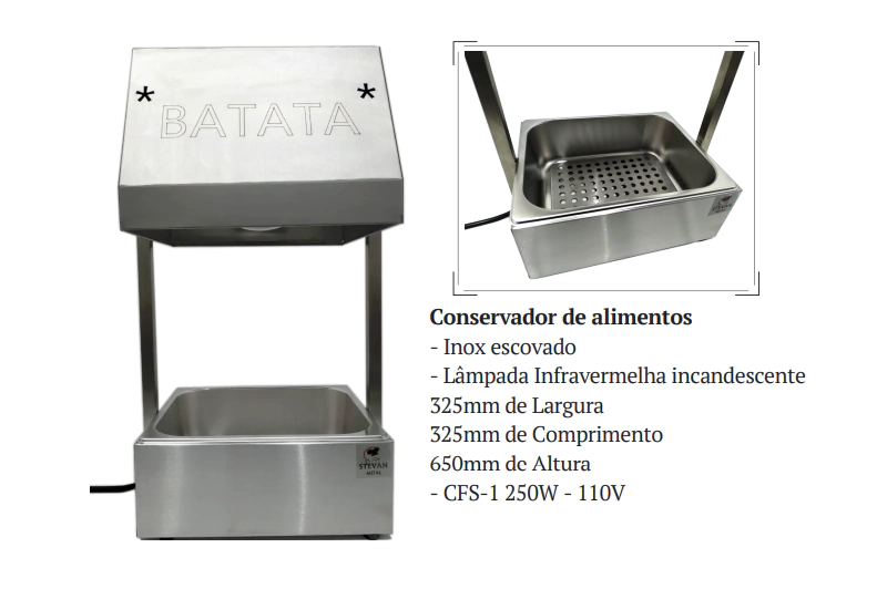 O Conservador de Frituras Stevan CFS1 é ideal para manter frituras e alimentos aquecidos, crocantes e prontos para servir. Produzido em aço inox escovado, oferece alta durabilidade, fácil higienização e acabamento profissional, sendo perfeito para cozinhas comerciais de todos os portes.