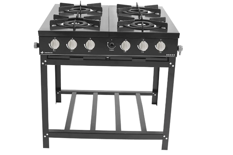 | ■ Fogão industrial; ■ Gás GLP baixa pressão; ■ Mesa esmaltada a fogo com easy clean, que facilita a limpeza; ■ Corpo super reforçado em aço carbono com acabamento em pintura a pó eletrostática com base fosfatizada; ■ Grelhas redondas em ferro fundido para todos os modelos; ■ Queimadores de alto rendimento, em ferro fundido, possuindo potência de 4.090kcal no modelo chama tripla frontal e 3.659kcal no modelo chama dupla; ■ Queimador chama interna, com espalha chamas em cobre; ■ Fogão com queimadores chama tripla; ■ Equipamento para uso industrial e profissional; | ||