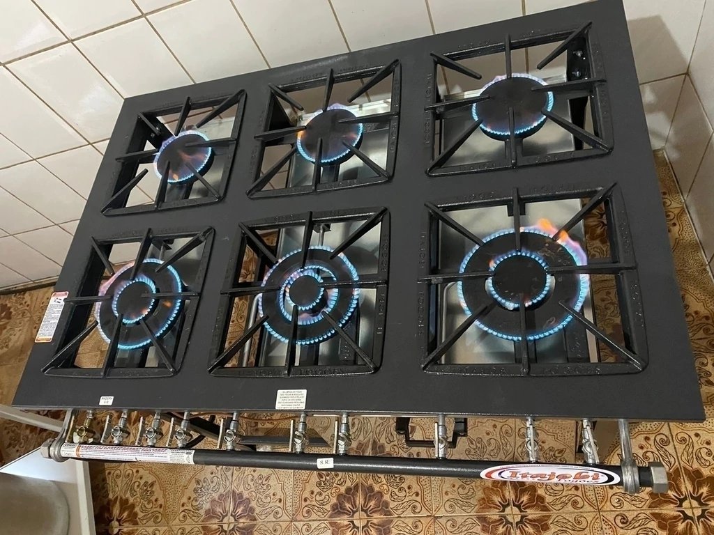 6 queimadores de ferro fundido: 3 simples (135 mm), 2 duplos (170 mm) e 1 chama tripla