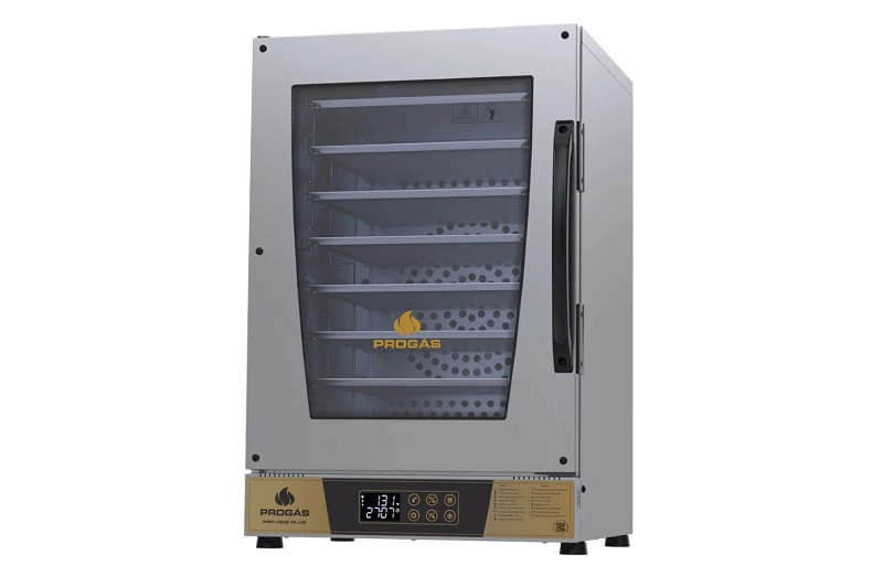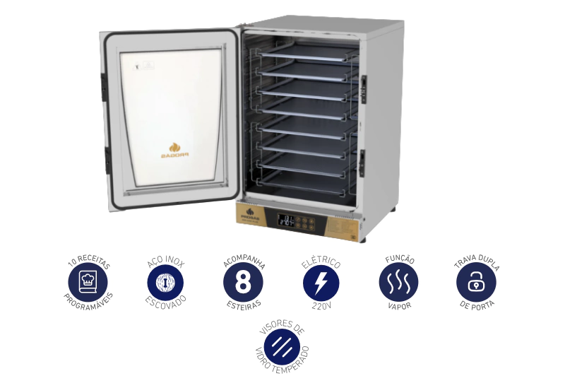 Forno Turbo elétrico com função vapor • Estrutura em aço inox escovado • Porta com vidro temperado e duplo travamento • Pés com regulagem • Puxador isolante • 8 esteiras 35x35 cm incluídas • Iluminação interna • Resistência blindada • Controle digital multifuncional com 10 receitas • Hélice com duplo sentido de giro (mais uniformidade) • Rack aramado com guia antiqueda • Temperatura máx. 250°C • Cores: dourado.